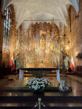 In der Mittel das Innere der Brigittenkirche, die heute die Hauskirche der